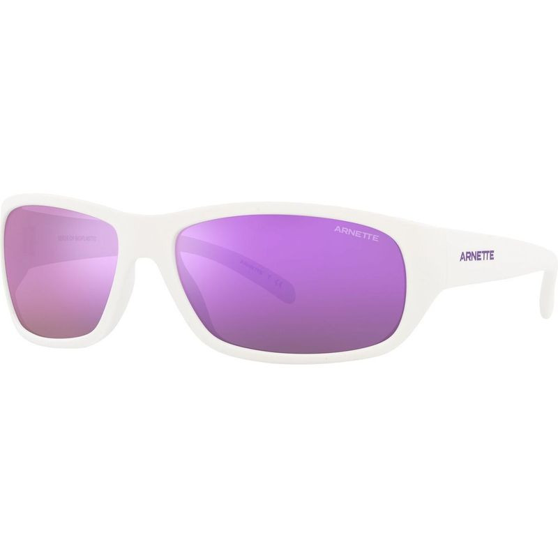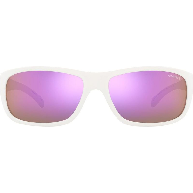 The Arnette Uka-Uka sunglasses are a style that provides high protection with their curved edges that wrap around the face offering a comfortable fit. grey and violet mirror lenses stand out against its white frame and help reflect the light entering into the eye. Arnette sunglasses are industry-leading in quality eyewear.
