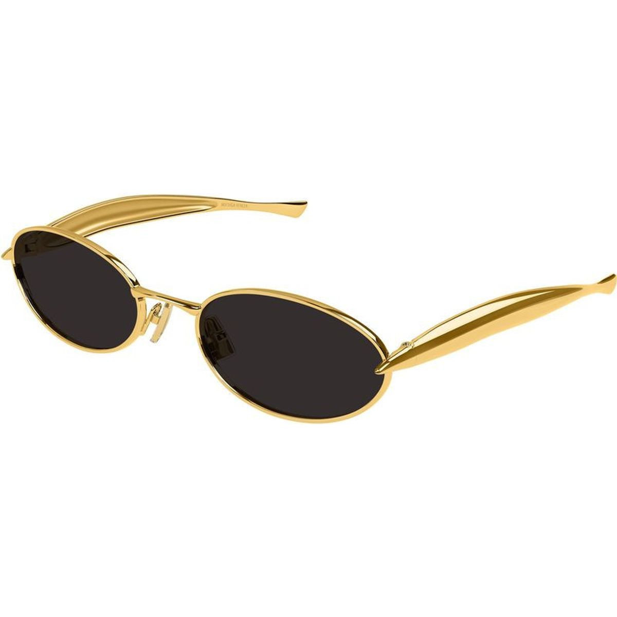 The BV1386S sunglasses by Bottega Veneta exude modern sophistication with a bold, fashion-forward edge. Featuring an oval silhouette, this frame is crafted in luxurious gold metal for a refined, statement-making look. Expertly made in Japan, this design is elevated by the brand’s sculptural sardine-shaped temples, a signature detail that turns every pair into wearable art. Paired with grey lenses, the BV1386S combines contemporary elegance with effortless versatility.