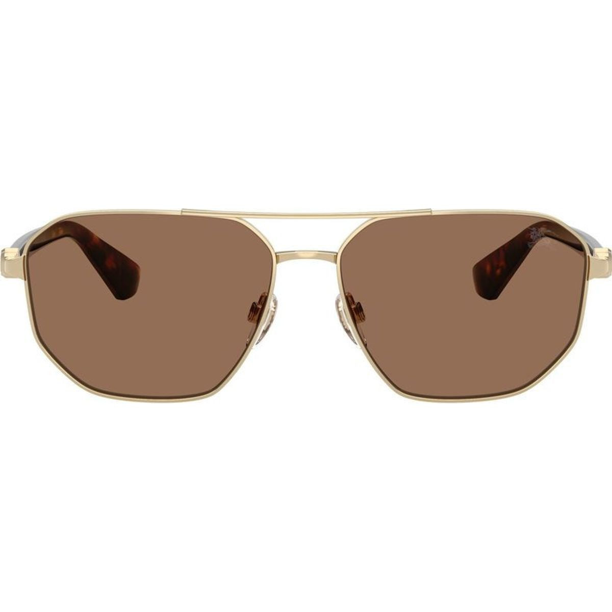The men's Burberry BE3166 sunglasses bring a modern edge to the classic aviator silhouette. Crafted with at least 50% bio-based acetate temples derived from renewable plant-based resources, the BE3166 combines contemporary design with a sustainable approach to luxury. The luxurious gold metal front is enhanced with a double bridge and adjustable nose pads for a comfortable fit. Paired with soothing brown lenses with a finely lasered EKD on the left lens, the BE3166 sunglasses ensure high UV protection and a heritage-inspired finish.