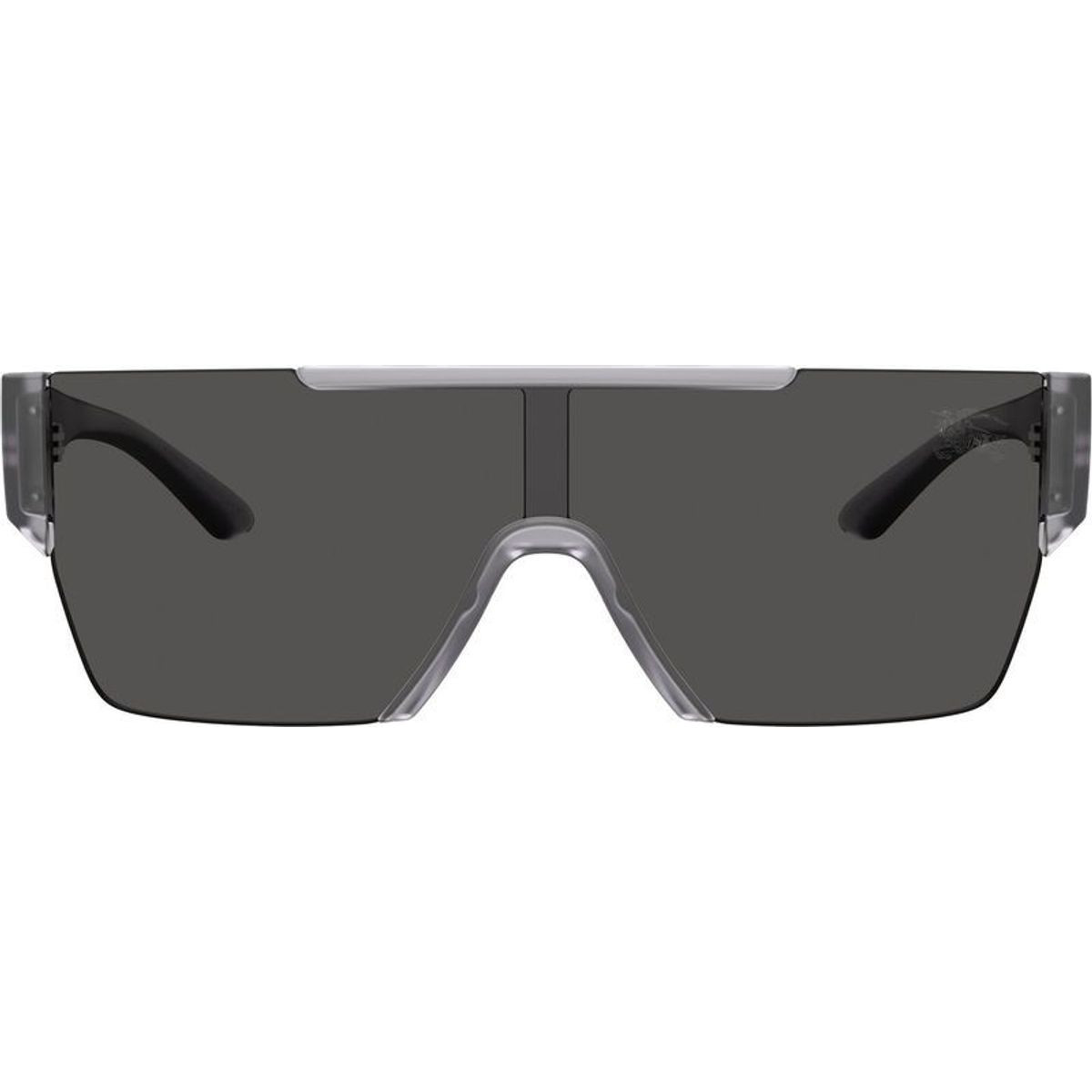 The Burberry BE4291 sunglasses are a runway-inspired design that commands attention with every wear. Boasting a daring shield silhouette, this style channels a bold, modern attitude for the discerning wearer. The sharp frame is enhanced with a flat browline, creating a fashion-forward look that will have heads turning. The transparent grey frame enhances the architectural lines, while a singular dark grey shield lens delivers a seamless finish.