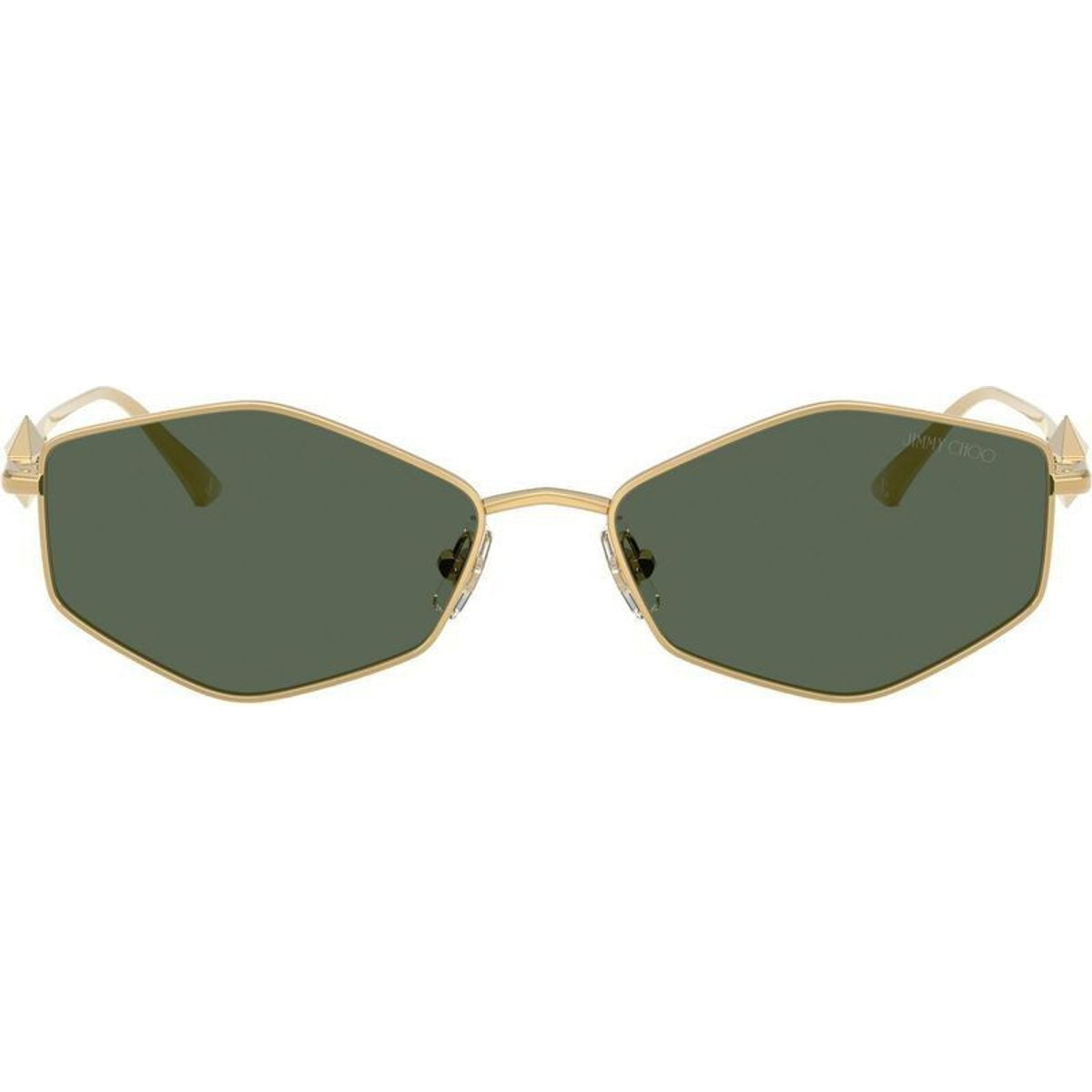 Make a glamorous fashion statement with the Jimmy Choo JC4017 sunglasses. Boasting a striking geometric silhouette, this ultra-slim design features a luxurious gold metal construction complete with refined temples adorned with a custom diamond-shaped metal insert and a laser-engraved Jimmy Choo logo for a sophisticated aesthetic. Finished with green lenses, the JC4017 sunglasses ensure high UV protection and create the perfect finishing touch for any ensemble.