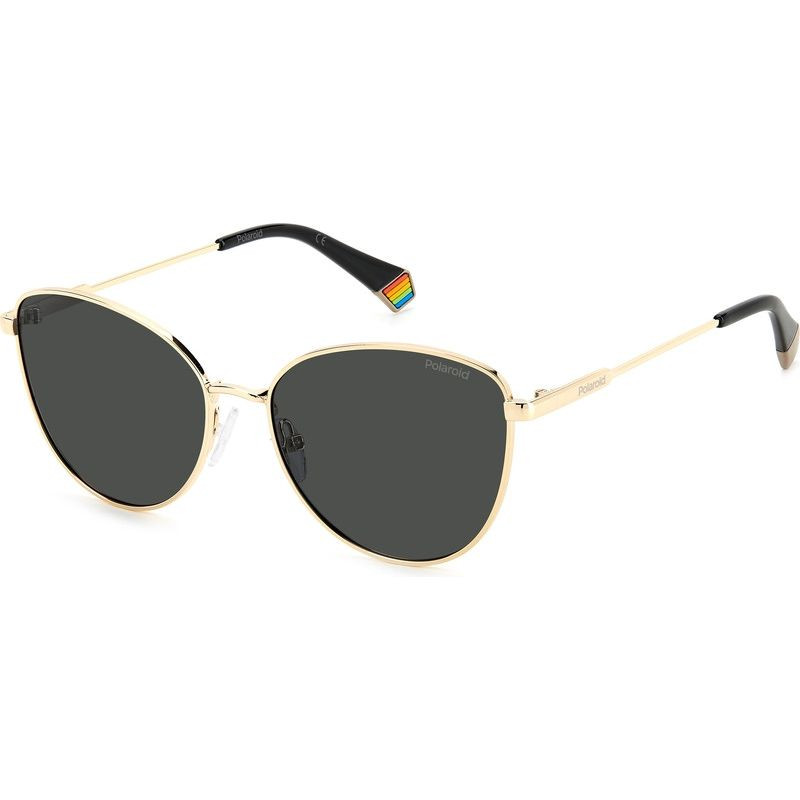 The Polaroid PLD 6188/S in gold offers a soft, feminine, cat-eye shape crafted with a lightweight metal frame, and will look and feel great on any occasion thanks to their impeccable style. The iconic rubber rainbow inserts on the end tips immediately pop, signing them as unmistakably Polaroid. The adjustable nose pads ensure comfort for all faces. Fitted with grey polarised lenses, these sunglasses are ideal for outdoor occasions.