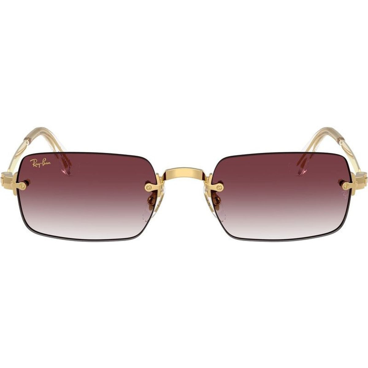 Meet the Ray-Ban RB3928 sunglasses - a striking rectangular silhouette that blends refined style and contemporary edge. Crafted as a sleek, rimless construction, this design exudes modern sophistication with a playful twist. The slender gold metal temples and soft contours offer a timeless, versatile aesthetic that complements any ensemble. Paired with vibrant violet gradient lenses, the RB3928 sunglasses provide a subtle pop of colour while ensuring essential UV protection.