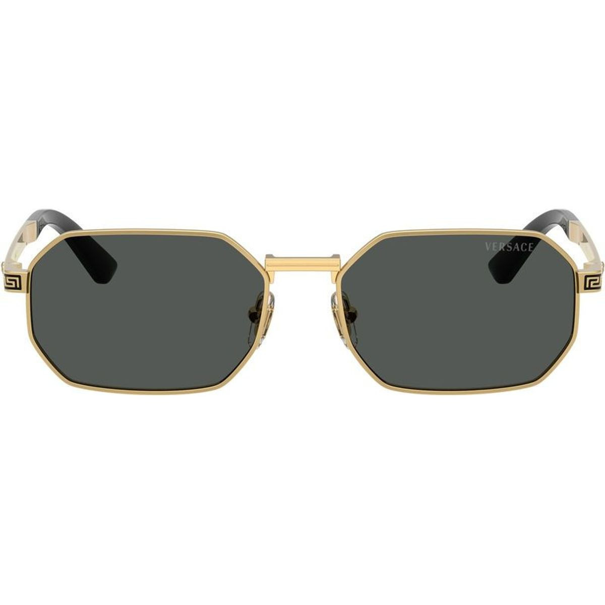 The Versace VE2297 sunglasses are the perfect accessory for those who command attention with effortless confidence. Boasting a striking geometric silhouette, this narrow design is constructed with architectural edges and a luxurious gold metal construction for an elegant aesthetic. The slimline enamel-coated temples are adorned with Versace's signature infinite Greca pattern and a signature Medusa motif for the perfect statement finish.